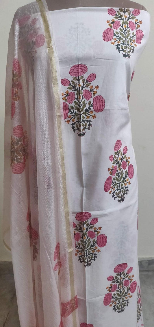 Exclusive Peach white Cotton Salwar Kameez Dress Material with Kota Dupatta BPK19