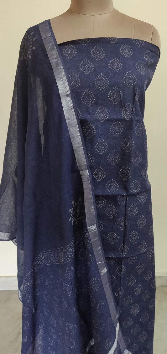 Navy Blue Block Printed Linen Cotton Suit BPL03