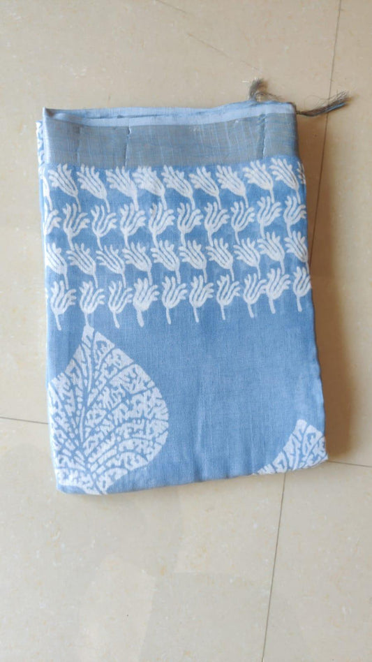 Sky Blue Linen Cotton Hand Block Printed Saree RF05