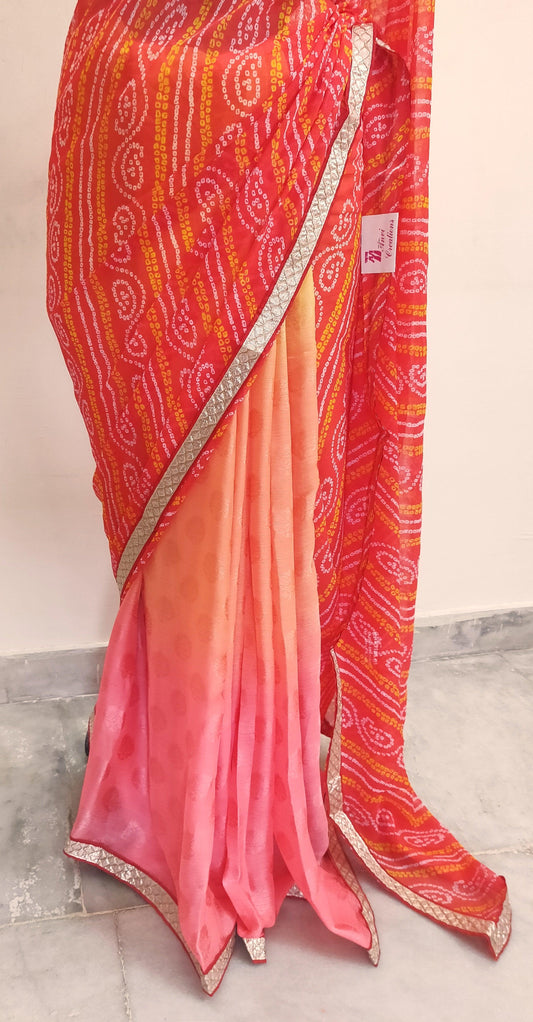 Designer Carrot Pink Printed Bandhej Bandhani Embellished Saree SP15