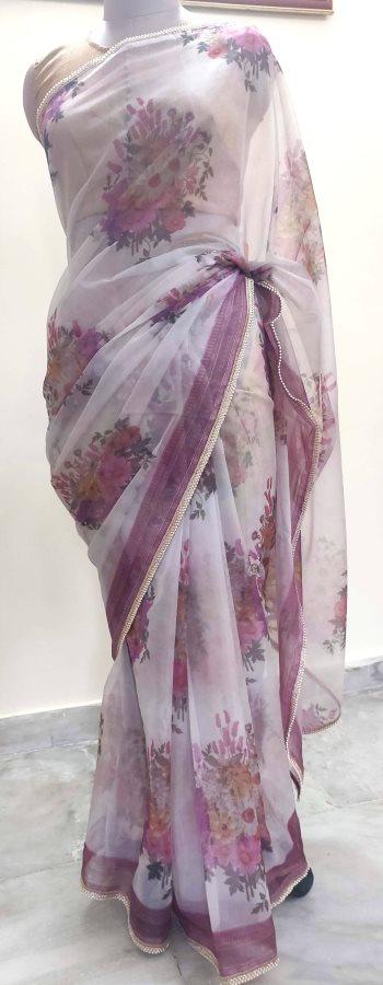 Designer Organza Onion Pink Printed Pearl Lacer Saree SP30