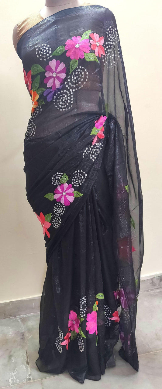 Designer Embroidered Black Shimmer Chiffon Saree SH01