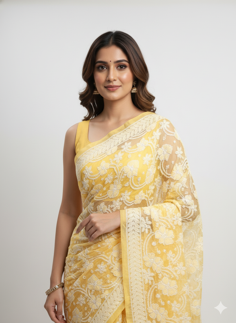 Hand Embroidered Heavy Chikankari Yellow Chiffon Saree CK24