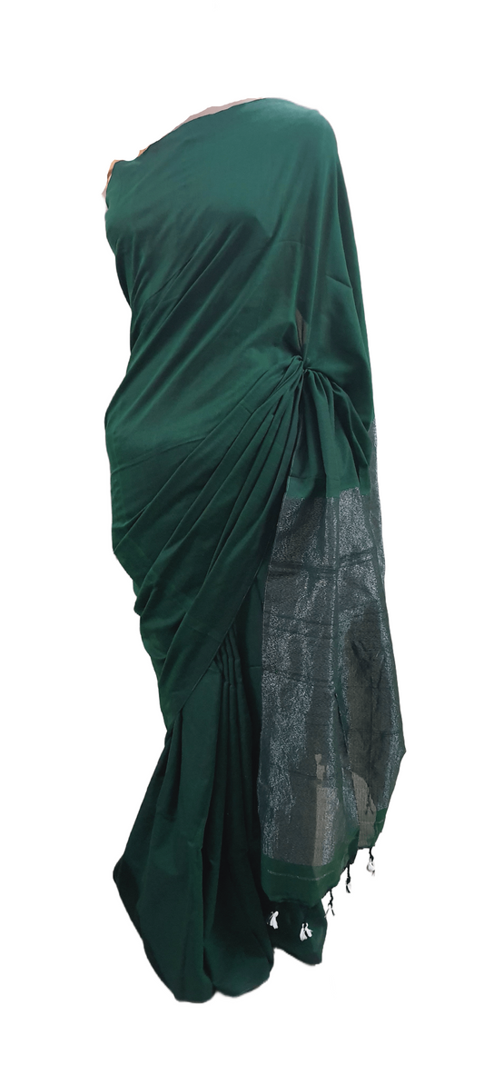 Dark Green Handloom Cotton Saree with Pure Ikkat Silk Blouse BHR01