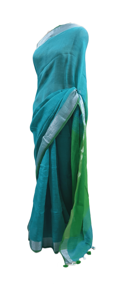 Blue Green Soft Linen Cotton Saree with Pure Ikkat Cotton Blouse BHR05