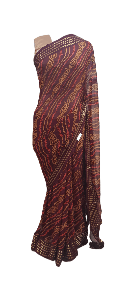 Maroonish Brown Bandhej Bandhani Printed Chinon Chiffon saree SHVGS02