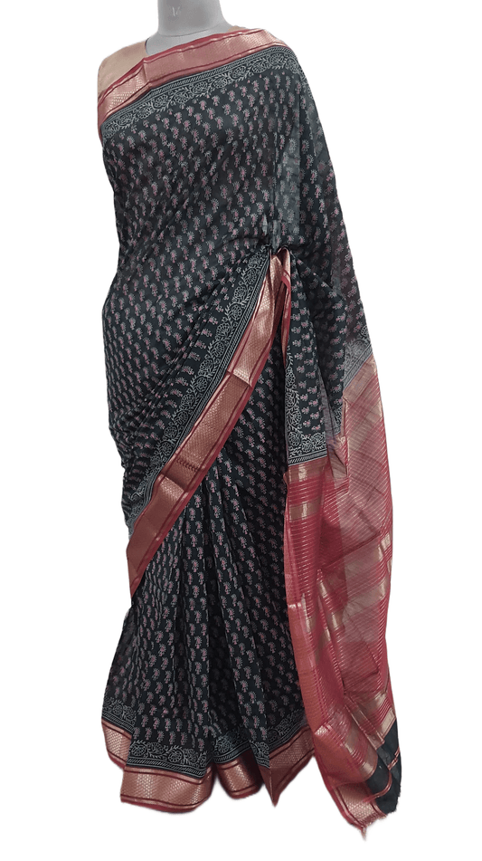 Pure Maheshwari Block Printed Cotton Silk Black Saree