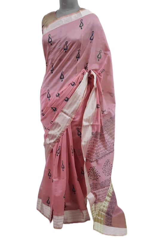 Pure Maheshwari Block Printed Cotton Silk Pink Saree