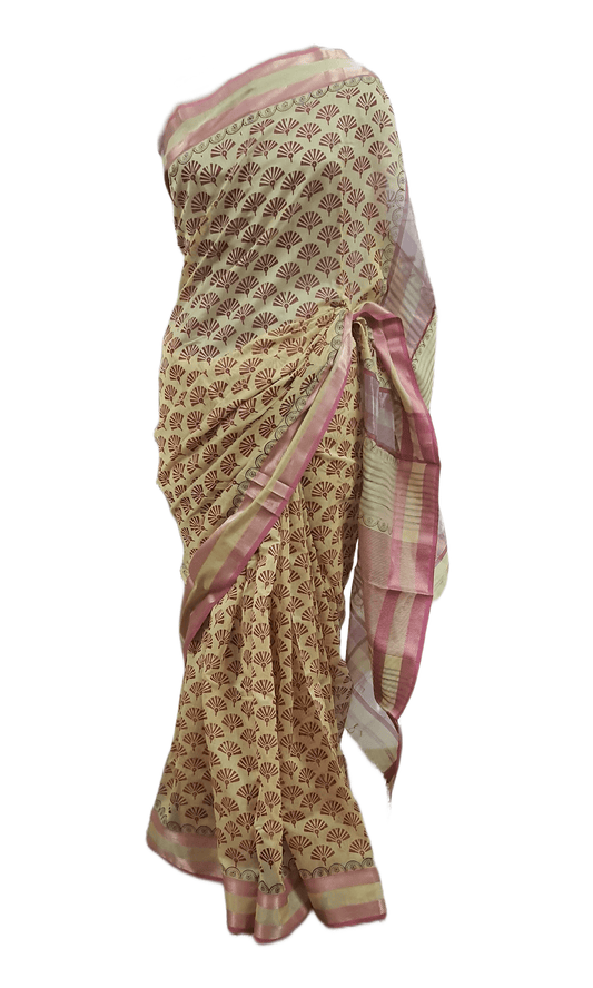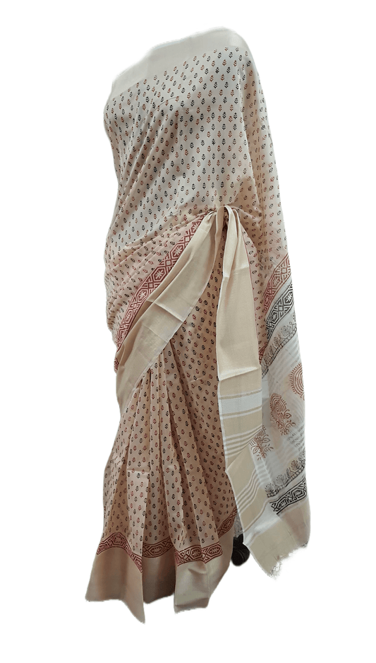 Pure Maheshwari Block Printed Cotton Silk Beige Saree