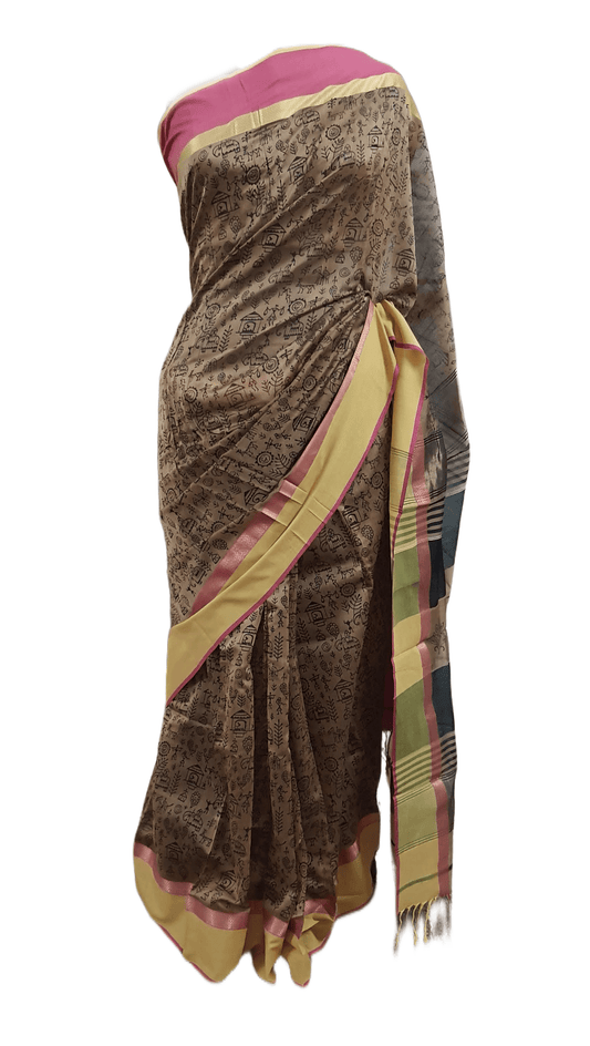 Pure Maheshwari Block Printed Cotton Silk Brown Saree