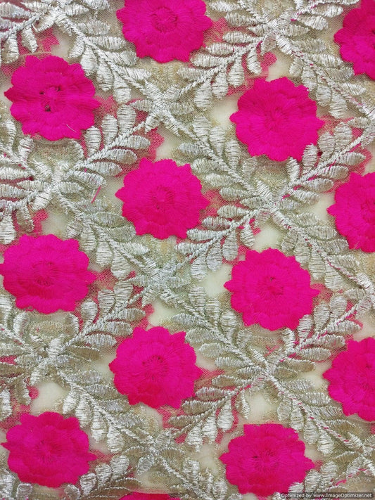 Designer Net Pink Zari stone Embroidered Fabric Pre Cut 2.5 Meters (255 Cms) FAB01