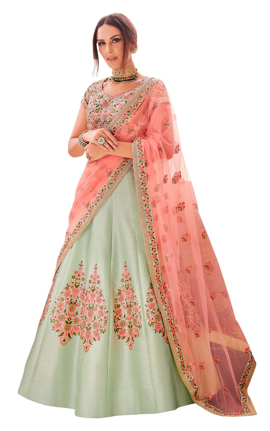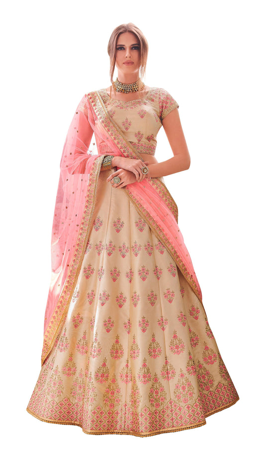Designer Peach Semi Stitched Satin Silk Lehenga Choli Dupatta 4154