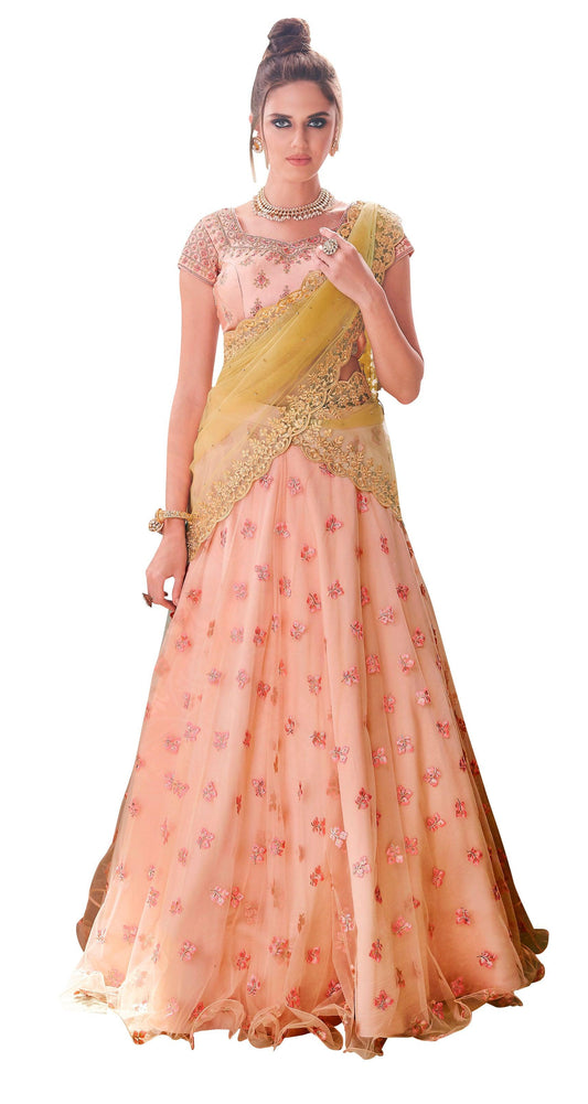 Designer Peach Semi Stitched Net Lehenga Choli Dupatta 4152