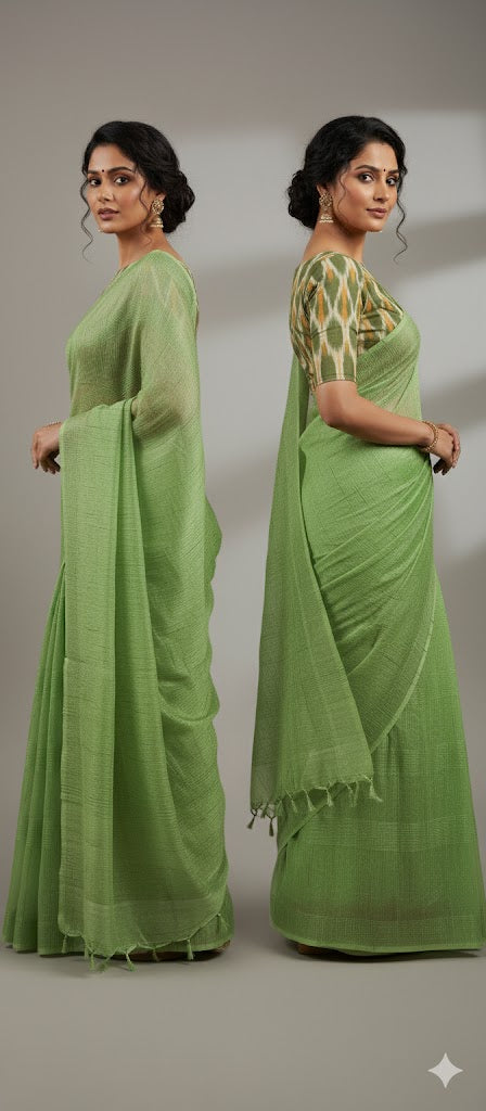 Green Katan Ghicha Saree with Pure Ikkat Cotton Blouse KG07