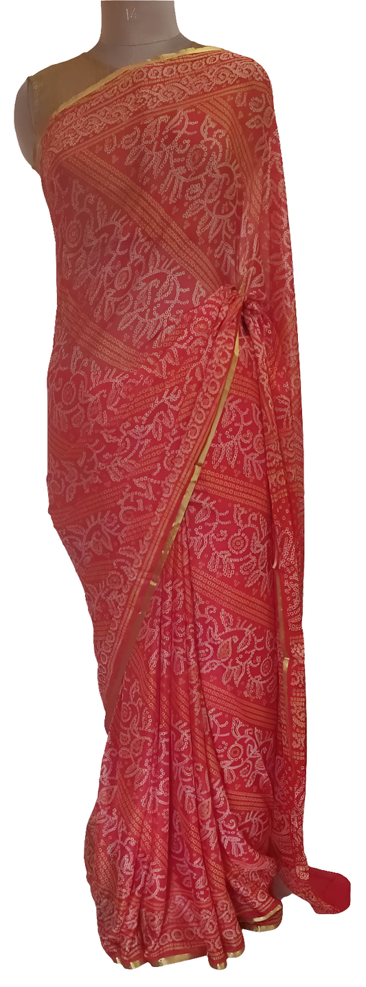 Beautiful Rust Red Printed Chiffon Bandhej Bandhani Saree