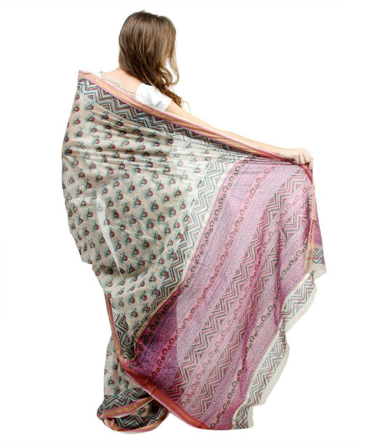 Block Printed Off White Maheshwari Mercerised Cotton Silk saree