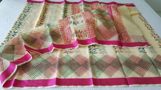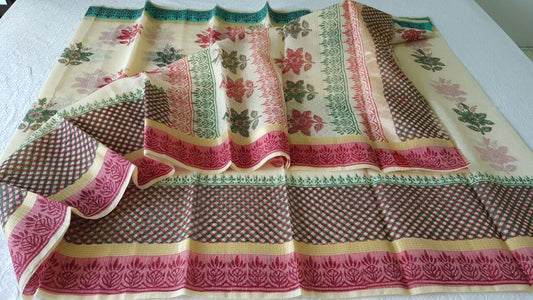 Designer Beige Block Printed Kota Cotton Saree KSC105