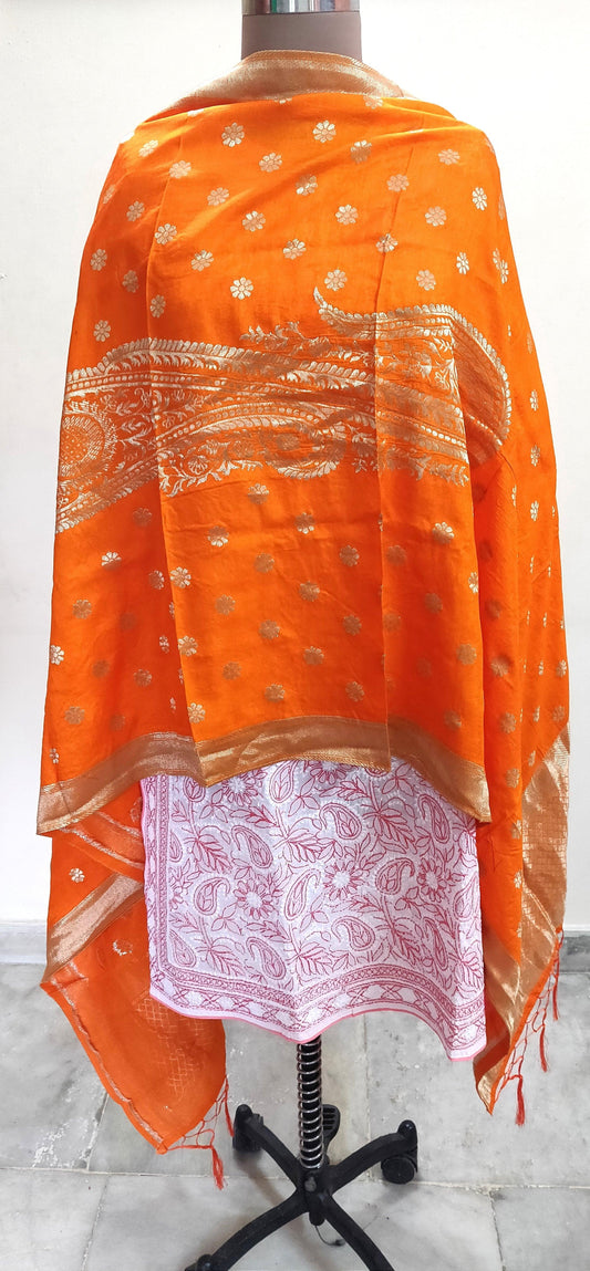 Designer Orange Dupion Silk Zari Weaven Banarasi Dupatta DP31