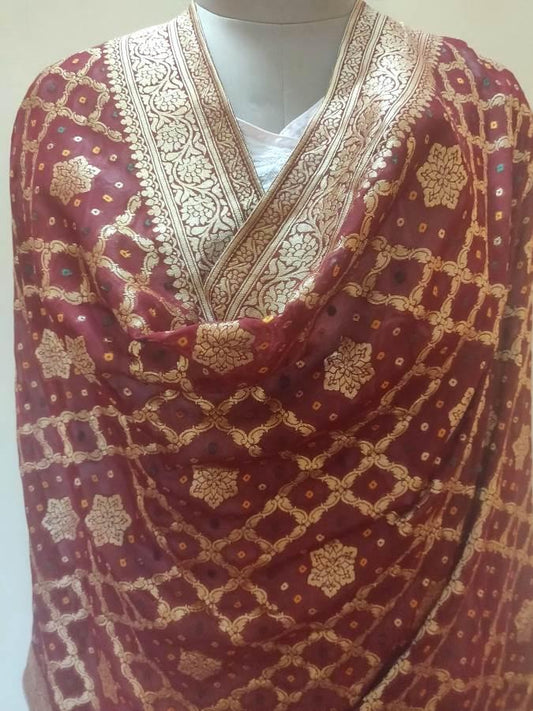 Designer Bandhej Bandhani Maroon Pure Georgette Zari Weaven Banarasi Dupatta DP43
