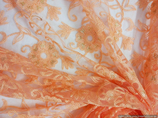 Designer Net Beige Orange Red Resham Sequin Jaal Embroidered Fabric Pre Cut 3 Meter FAB034