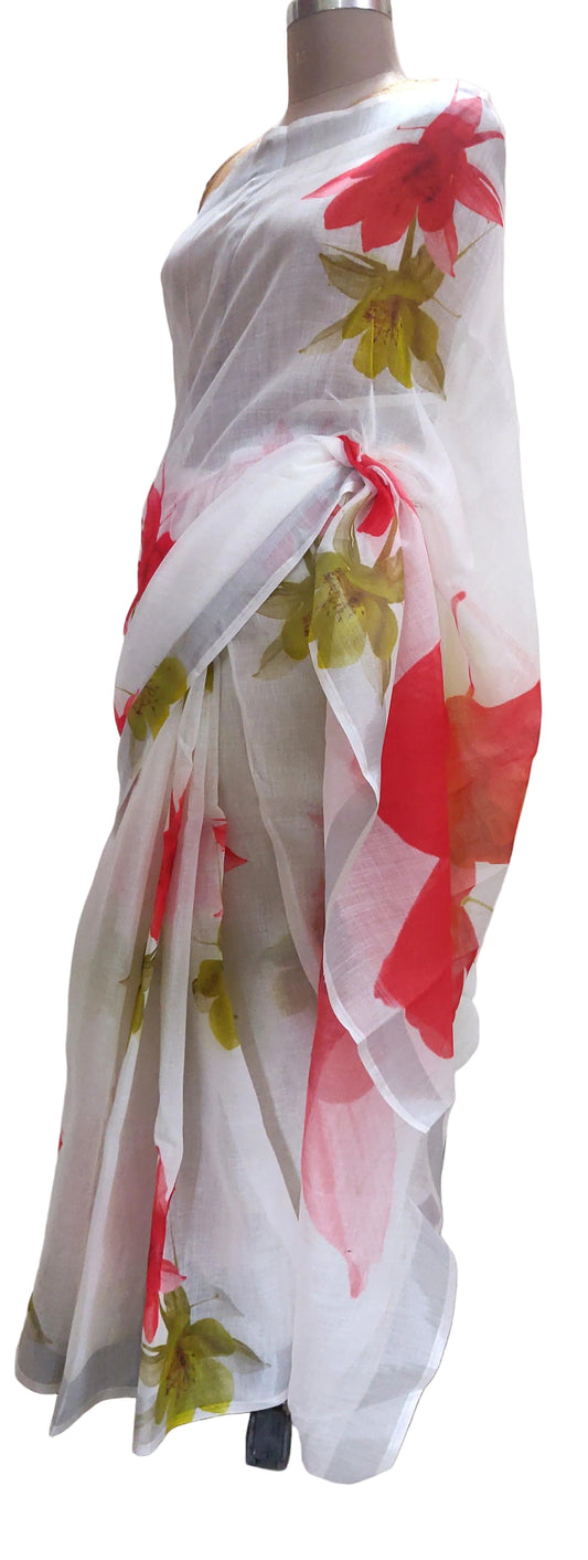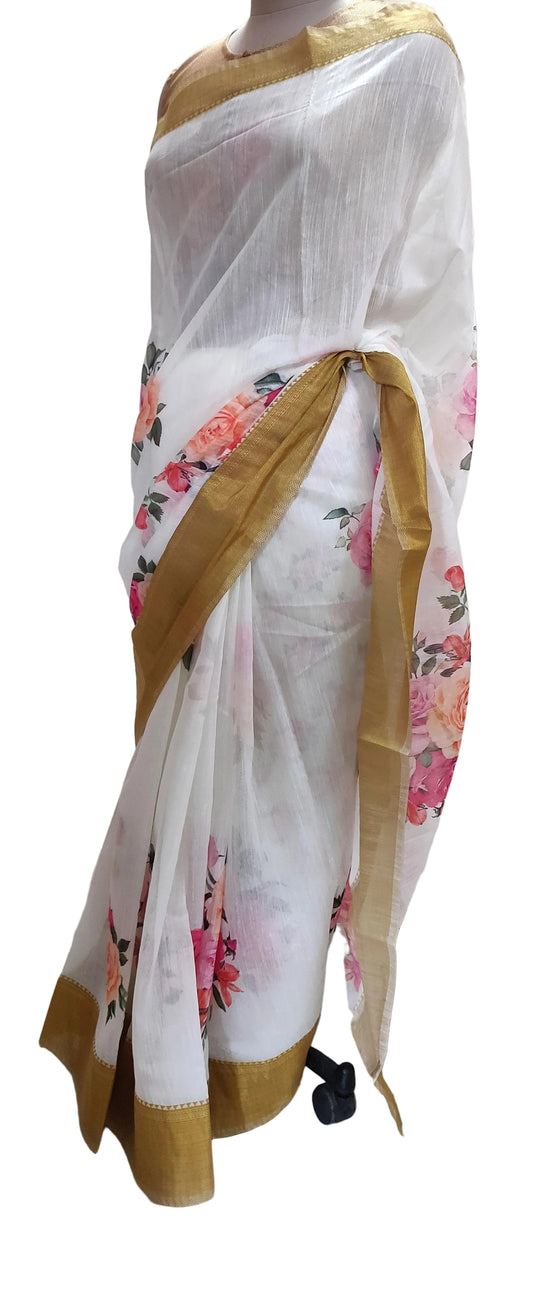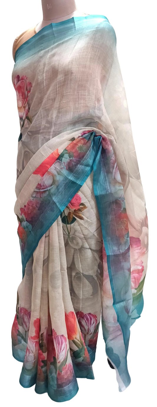 Designer Off White Floral Printed Linen Silk Saree ND05