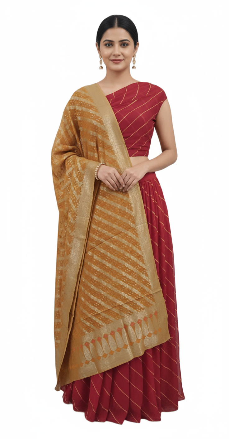 Discover the beauty of traditional Indian attire with our breath-taking Leheriya Lehenga Choli. Incredibly stylish and unique, this three-piece ensemble is designed with the vibrant, wave-like patterns of Rajasthan's renowned Lehariya technique. Handcrafted in a lovely chiffon material, the Lehenga swirls with every step you take while the choli perfectly flaunts your grace and poise. Match it with its accompanying dupatta, draping it in your desired style for a complete festive look. Ideal for events such as Teej, Raksha Bandhan, and Karva Chauth, this Leheriya Lehenga Choli set is sure to turn heads wherever you go.