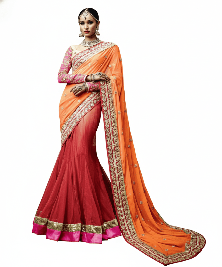 Designer Lehenga Saree in Net & Georgette with Heavy Embroidery – Wedding & Reception Wear